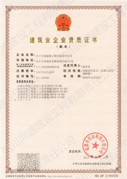四川向通建設工程有限責任公司 四川向通建設工程有限責任公司成立于2007年,注冊資本金5060萬元,是一家專業從事瀝青混合料生產、專業分包以及市政道路、公路、路基工程專業施工建設的企業。公司注冊地址及生產廠區位于成都市雙流區金橋鎮茂生街115號,總占地面積約120畝;辦公地址位于雙流區海濱城海濱廣場7座11樓。公司生產廠區(雙流金橋)現有LB-5000型瀝青混合料拌合樓1套,每小時瀝青混合料生產量可達380噸。此外,根據項目需要,公司在多地建立4000型拌合站以服務施工(廣安齊福、達州、綿陽等),每小時瀝青混合料生產量為320噸。各種國內外道路施工機械:攤鋪機、壓路機、銑刨機、灑布車、封層車、吊車、拖車、等70余臺,可滿足各種道路施工需求。公司近100輛保溫運輸車輛均安設保溫板、加塞保溫棉、覆蓋棉絮和隔熱防水雨篷,有效減少瀝青混合料在運輸過程中的溫度流失進而保證瀝青路面的施工質量。 公司目前擁有眾多優秀的技術人才,成熟的市場渠道,良好的企業聲譽。現有各專業施工人才共計79人;5支專業的施工班組可根據現場的具體情況制定實施性施工方案。今后公司將竭誠為各界客戶提供出色的產品和服務及具有競爭性的價格和具有創新精神的高效解決方案。 公司曾經榮獲:新津鄧雙段被新津縣政府評為“優良工程”;雙流宗申大道被雙流縣政府評為“優良工程”;成都后花園被成都市政府評為“重合同守信譽單位”;被三一重工評為“有遠見單位”。并在2018年1月被中國五冶集團評為“優秀供方”;同年3月被四川交投評為2017年度“優秀合作單位”的榮譽。榮譽的背后是我們公司所有員工堅持不懈的努力。 作為現代化的企業,公司將以技術為切入點,以信譽為支撐點,以市場為著眼點,促進管理創新和技術創新。因此我公司能在短時間內迅速發展成為一家擁有各類中大型施工機械設備的公司。在今后的工作中我們將借用現代電子信息溝通的便利為公司的發展助力,同時將秉承發揚以往的團結拼搏精神,推動公司成為“快穩型”發展的企業。 在未來的發展過程中,四川向通始終秉承“以質量求生存,以信譽求發展”的企業管理理念,以“啟后為先創佳績,爭做路建行業標”的企業宗旨與建設單位建立合作關系,創造更加輝煌燦爛的明天! 四 川 向 通 建 設